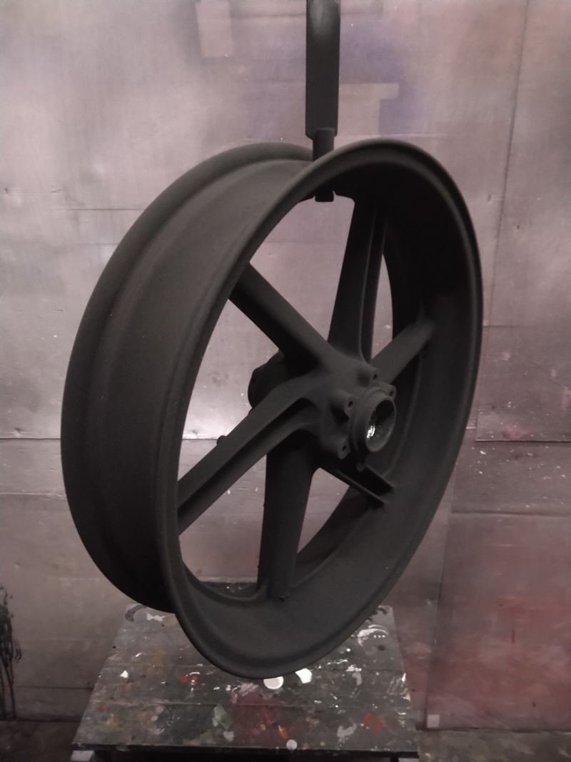 古い塗装を剥離剤ではがし、水洗い、予備乾燥、パウダー塗射、乾燥となります。